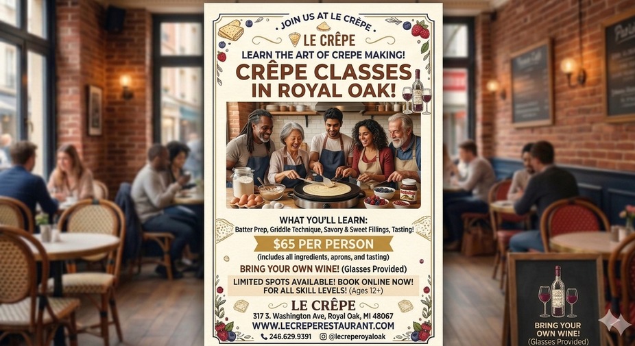 Where: Le Crêpe, 317 3. Washington Ave, Royal Oak, MI 48067 Cost: $65 per person (includes all ingredients, aprons, and tasting) What's more: Bring Your Own Wine! Glasses will be provided. Who: All skill levels welcome, ages 12+. Book now: Limited spots available! Visit www.lecreperestaurant.com to book your spot.
